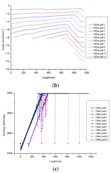 Equidistant offset paths based on partition and its manufacturability. (a) Equidistant offset paths based on partition. (b) Angular deviation of each offset path. (c) Steering radius of each offset path.