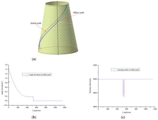 Circumferential averaging planning trajectory and its manufacturability. (a) Circumferential averaging path planning. (b) Angular deviation of each offset path. (c) Steering radius of each offset path.