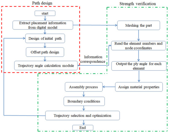 In order to realize finite element analysis based on path design, the path design software is developed by CATIA secondary development technology. The software can design the path of fixed angle, geodesic and variable angle, and can calculate the angle of the center point of each triangular patch. The flow chart in Figure 12 illustrates the detailed process.