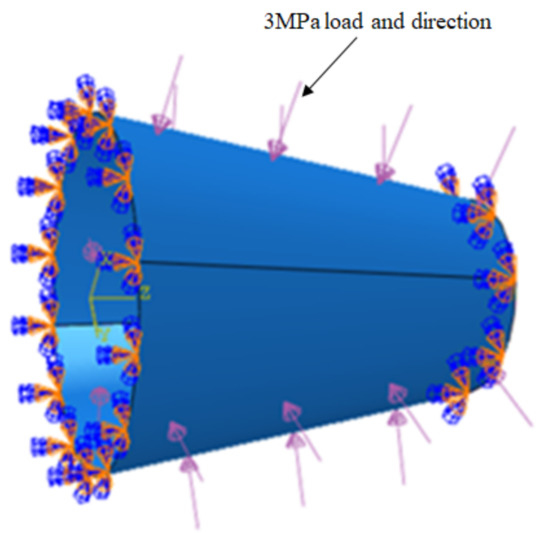 The composite prepreg used in the experiment is EH104-HF40-D6/12 made by Jiangsu Hengshen Co., Ltd. of CHINA, and the performance parameters of the material are shown in Table 1. The prepreg tow had a slitting width of 6.35 mm, a nominal thickness of 0.15 mm. In this paper, the conical shell skin adopts the shell element and S3 element. The total number of units is 8528 and the number of nodes is 4368. The layer of the cone shell model created is symmetrical with 24 layers, the total thickness is 3.6 mm, and the layering sequence is designed as [45/0/−45/90]3s. The internal pressure of 3 MPa provided by the design department was applied to the external wall of the conical shell to analyze its static mechanical properties. Static pressure loading is shown in Figure 13. In addition, both the big end and the small end are imposed fixed support constraints.