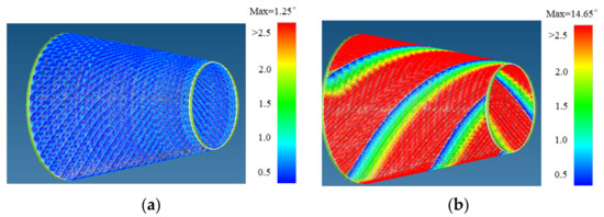 - By comparing the circumferential averaging variable angle path design method (Figure 13a), the partition variable angle path design method (Figure 14b) has smaller angle deviation, and the gaps/overlaps position are more evenly distributed on the surface of the conical shell. The possible explanation is that the size of path angle deviation and the position of the overlapping area formed by different path planning methods have a great impact on the mechanical performance. Therefore, the organic combination of defect suppression, path planning, and strength analysis greatly ensures the rationality of path design, which makes it possible to lay high-quality and efficient, especially for complex rotating bodies.