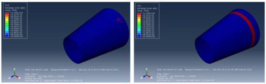 In order to verify that the optimized placement path has good quality, the strength of composite components manufactured by two different path design schemes is analyzed. The experimental tests (Figure 17) were conducted in the full range of loading, until the structure’s failure. In addition, numerical simulations were conducted the finite element method in ABAQUS, as shown in Figure 18. The total load is 6 MPa. The set load increased by 6/50 for each incremental step, which is reflected in the time step. Increase the time of each incremental step by 1/50 = 0.02 s. The experimental results and simulation analysis are shown in Table 4.