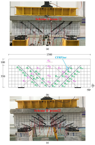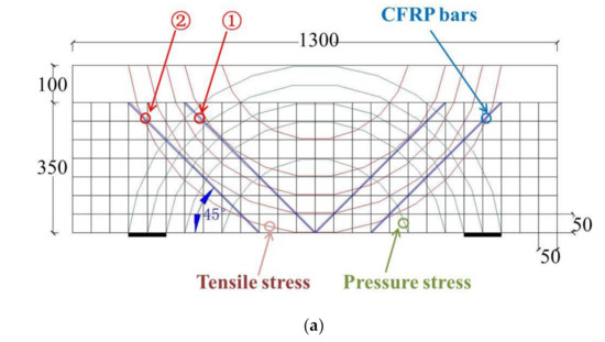 Scheme I. The CFRP bars are applied to be tangent to the tensile stress trace, which provides a 45° angle to the beam belly horizontal line. The two ends of the CFRP bars align with the belly upper and the bottom, respectively (Figure 12a).