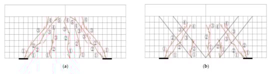 According to Figure 11a, the high strain zone in the beam is also concentrated in the area between the loading points and supports. The compressive force flow is concentrated along the transmission path, which can, consequently, be considered as a strut. In contrast, the transverse tensile force flow is intense at the bottom of the beam, which may be treated as a tie accordingly. Thus, the ‘strut-and-tie’ model [30,31] can clearly represent the distribution of force flow. This interprets the occurrence of the arching effect in deep beams.
