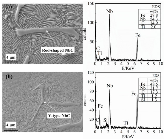 - Niobium in the cast iron may be in solid solution, in the form of cuboid NbC precipitates or in the form of cuboid NbC precipitates. When the niobium content is low (0.098% Nb), the elongated NbC niobium-rich phase is the main form; cuboid precipitates only form at higher niobium concentrations (0.27% and 0.46% in this work). The number and size of the precipitates increase with increasing niobium concentrations.
