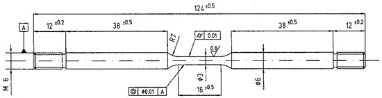 SSRT tests were also conducted using round dogbone samples whose geometry is schematically reported in Figure 1, by means of a homemade SSRT testing machine with four independent loading stations. The load was applied through an electric motor and reduction gears that could impose displacement rates between 5 × 10–7 and 5 × 10–3 mm/s. The calibration of the cells was performed independently. Acquisition system (spider 8 HBM Italy, Milano, Italy) recorded the load and a function of time. A strain rate of either 3.15 × 10−6 s−1 or 3.15 × 10−5 s−1 was chosen.