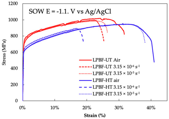 SSRT results of LPBF-UT (red line) and LPBF-HT (blue line) at 3.15 × 10−6 s−1 in air, at 3.15 10−6 s−1 in SOW under cathodic protection, and at 3.15 × 10−5 s−1 after hydrogen pre-charging.