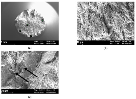 The fracture surface of the heat-treated specimen at the end of the SSRT test with strain rate 3.15 × 10−6 s−1 cathodically polarized at −1.1 V vs. Ag/AgCl in SOW was totally flat (Figure 7a); there were two large trigger zones by hydrogen embrittlement (denoted with A in the Figure 7a) with a morphology similar to the UT specimens (Figure 7b), with flat facets arranged in a radial direction, separated by longitudinal microfractures and flat areas of cleavage. Even the center of the specimen appeared with a quasi-cleavage morphology (areas B and C—close-up in Figure 7c), with a sporadic presence of small dimples.