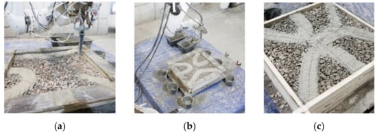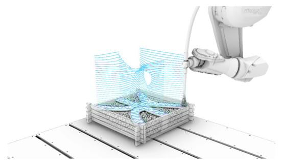 Material extrusion and jetting involve the deposition of strands with extrusion [23,24] or spraying [17,25], respectively, of the premixed material through a nozzle. Here, two strategies can be distinguished: (I) the deposition of narrow strands of several centimetres width, which are either stitched to create the desired structure or used to build a filigree formwork structure strengthened by an inner structure (compare with concrete printing [26,27,28] and contour crafting [29,30,31,32]) and (II) the deposition of broad strands of several decimetres width, which are used to build the whole width of the component in a single pass as a kind of “infinite brick” (compare with, e.g., ConPrint3D [33,34]).