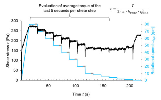 A rotational velocity-controlled rheometer profile defined by a sequence of rotational speeds is used for the material characterization. The profile consists of a linear increase in rotational speed and then a stepwise decrease in rotational speed, whereby each step has a duration of 15 s. For the evaluation of the material’s rheological properties, the data of the first eight downward ramps are used for a Bingham evaluation. For the evaluation the torque T (Nm), values of the last five seconds of each rotational step are averaged. In Figure 2, the shear profile and an exemplified measurement of ST0.0_SP 0.4% are shown. Finally, the Reiner–Riwlin equation is used to calculate the Bingham model parameters (plastic viscosity and yield stress) [45,46].