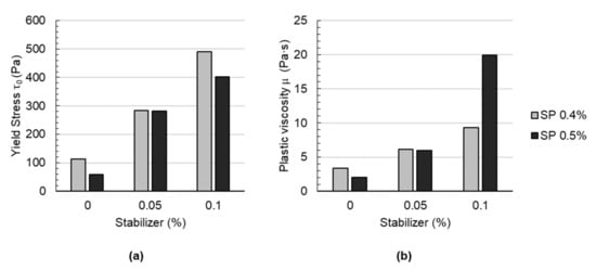 Rheological parameters of the sprayed concrete: (a) yield stress and (b) plastic viscosity of mortars containing various amounts of stabilizer and superplasticizer.