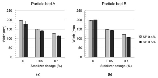 A decrease in strand width is observed for particle bed A and B when the stabilizer dosage is increased; see Figure 5. Compared to the effect of the stabilizer dosage, the effect of various dosages of the superplasticizer is negligible. The mean width of the strands is with 151.5 mm, which is slightly lower for particle bed A than for particle bed B with 153.2 mm. It may occur that the shotcrete material tends to penetrate the particle bed A more in a vertical direction than in particle bed B. In particle bed B, the resistance for vertical penetration is higher due to the higher packing density. Due to a higher penetration resistance in the vertical direction, the material may tend to distribute more in a horizontal direction on top of the particle bed.
