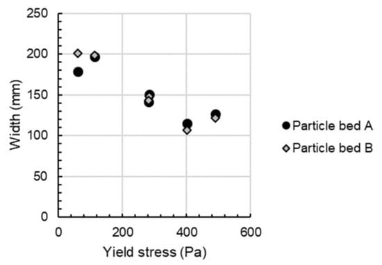 Additionally, it can be stated that the width of the strand is highly dependent on the rheological properties of the material. In Figure 6, it is shown that an increase in the shotcrete’s yield stress correlates with a decrease in the width of the strand. For example, when the yield stress of the material is increased from 59.6 Pa to 490.7 Pa, the strand width decreases from 200 mm to 122 mm for particle bed B.