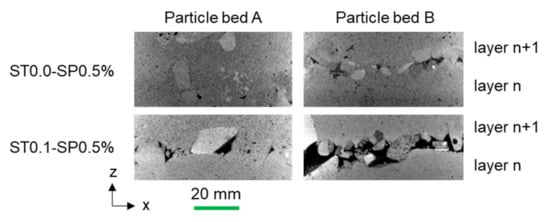 In Figure 8, µCT investigations of the area in between two layers for specimens without the stabilizer (ST0.0–SP0.5) and with a high stabilizer dosage (ST0.1_SP0.5) are shown for particle bed A and B. The tendency of a better structural bonding (and fewer voids) in between two layers when less stabilizer is used, as observed before on the outside of the drilling cores, is also evident here. Moreover, particle bed A is favorable compared to particle bed B since voids are reduced, and thus there is better interlayer bonding.