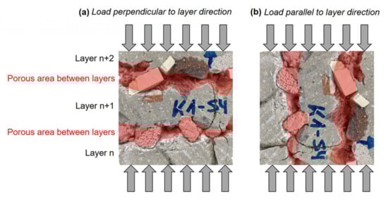 The mechanical characterization of the specimens, based on compressive strength tests after 28 days, is shown in Figure 10. The diagrams presented show the results of printed specimens for particle bed A (upper diagrams) and B (lower diagrams), for the superplasticizer dosage 0.4 (left) and 0.5% (right) and for a load application perpendicular (dark grey bars) and parallel to the layer orientation (light grey bars). Furthermore, compressive strength values of the pure shotcrete material, i.e., without particle bed aggregates, cast in moulds without pressurized air are displayed as dashed bars.