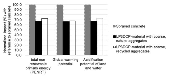The LP3DCP technology allows one to reduce the amount of cement by increasing the volume and size of the aggregate. By using recycled materials, the possibility to reduce the CO2 footprint even further is given. Together with the material savings that can be achieved using digital production methods, building components with a significantly reduced CO2 footprint can be produced [6,40]. Additionally, the implementation of large particles in the process is assumed to enable high strengths, less shrinkage, improved durability and lower cost per functional unit [38].