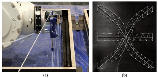 - Hack, N.; Bahar, M.; Hühne, C.; Lopez, W.; Gantner, S.; Khader, N.; Rothe, T. Development of a robot-based multi-directional dynamic fiber winding process for additive manufacturing using shotcrete 3D printing. Fibers 2021, 9, 39. [Google Scholar] [CrossRef]
