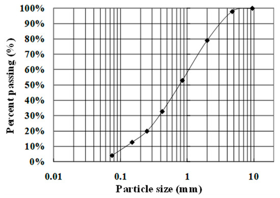 The soil samples used in this study were weathered granite soil samples. It is the most extensively distributed soil type in Korea [40] and is a typical nonplastic cohesive soil that contains fine-grained soil. The soil sample was classified as SW based on the USCS. The particle size distribution and engineering properties of the soil are shown in Figure 2 and Table 1, respectively. The model soil for the pullout tests was compacted with an optimum water content of 14.1%, and a maximum dry unit weight of 18.8 kN/m2 was achieved. The shear strength of the soil by direct shear tests was 8.7 kPa, and the internal friction angle was 35.6°.