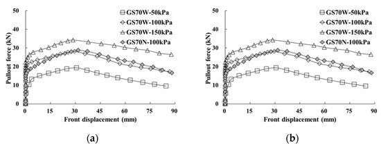 In the cases of normal stress conditions of 50, 100, and 150 kPa, the maximum pullout forces were found to be 14.6, 20.4, and 26.8 kN for GS50W, and 19.3, 28.2, and 34.3 kN for GS70W, respectively.