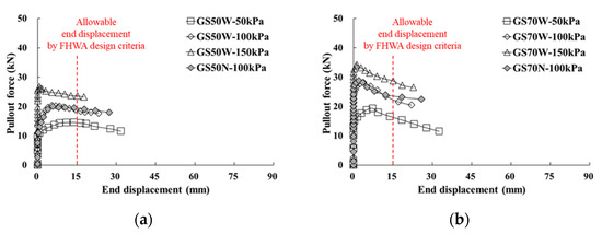Based on the pullout force–pullout displacement relationship from the pullout test results, the pullout strength characteristics of the reinforcement can be evaluated using the maximum pullout force at each normal stress condition. In this study, the maximum pullout force for pullout strength evaluation was selected by referring to the displacement criteria suggested in the FHWA design criteria [38]. In other words, when the end displacement of the reinforcement installed in soil was less than 15 mm, it was necessary to determine the development of the maximum pullout force. This means that the pullout force corresponding to an end displacement of 15 mm must be applied as the maximum pullout force if the end displacement of the replacement exceeds 15 mm in the case in which the maximum pullout force was developed. Therefore, as shown in Figure 5b, the measurement position of 110 m from the front sides of the linear variable differential transformers installed in the reinforcement was applied as the end displacement.