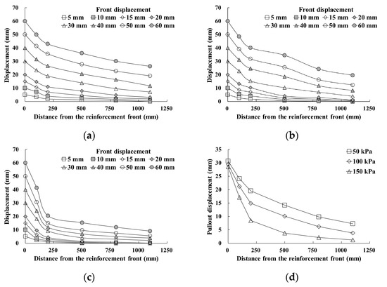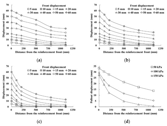 Displacement as a function of distance from the geosynthetic strip front: (a) GS70W-50 kPa; (b) GS70W-100 kPa; (c) GS70W-150 kPa; (d) pullout displacement of reinforcement in maximum pullout.