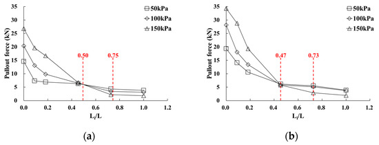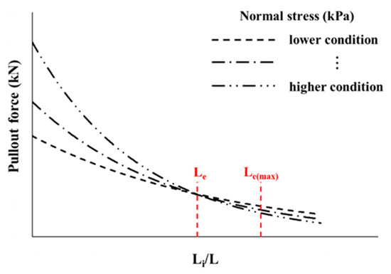 The pullout force distribution in the geosynthetic strip occurred within a limited reinforcement length range. Therefore, it will be possible to achieve a more economical design if the effective length at which the pullout resistance is induced by the pullout force is calculated. The relationship between the pullout force and Li/L (as shown in Figure 10) can be simplified as shown in Figure 11, and it is possible to be used to reflect the experimental results. As mentioned previously, in the cases of GS50W and GS70W, the pullout forces of the reinforcement at normal stress conditions became almost similar at a length ratio (Li/L) of approximately 0.5 L. Subsequently, the induced pullout force decreased and then hardly changed after 0.75 L, at which the strain became approximately 1%. Therefore, the effective length of the geosynthetic strips used in this study was determined as follows: the effective length (LE = 0.5 L) was defined as the length at which the pullout force became almost similar, regardless of the normal stress, and the maximum effective length (LE(max) = 0.75 L) as the distance at which the pullout force hardly changed.