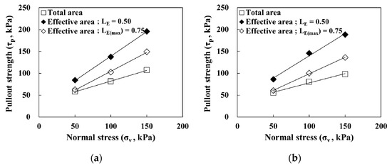 To evaluate the effective length prediction method presented in Section 4.3, the pullout strength was evaluated according to the effective length (LE) and maximum effective length (LE(max)), respectively, based on the use of the average resistance method proposed by [23]. The pullout strength was evaluated using the total and effective area methods based on consideration of the extensibility of the geosynthetic strips, and the results are shown in Figure 12 and Table 3.