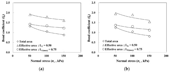 Relationship between normal stress and bond coefficient: (a) GS50W; (b) GS70W.