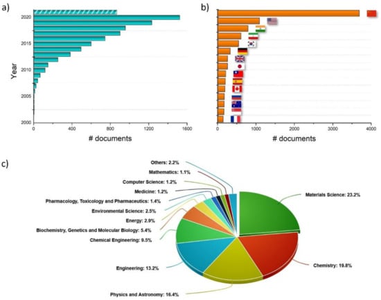 Pictorial representation of the data retrieved by Scopus database: (a) number of scientific reports per year, (b) distribution of the GQD literature with respect to the researchers’ geographic localization, (c) distribution of the GQD literature with respect to the research field.
