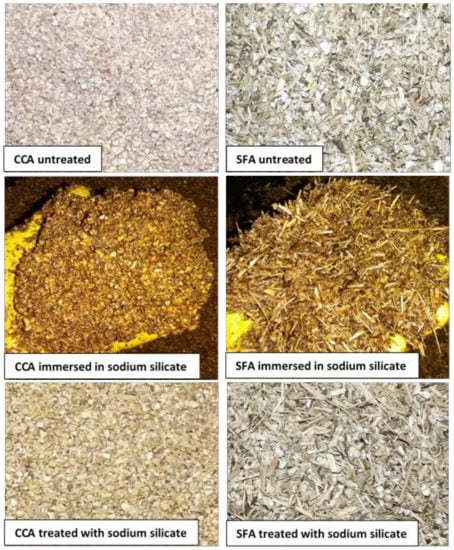 The corn cobs and sunflower stalks, respectively, were grounded with a mill for animal feed crushing; the corn cobs resulted in granules with 2–6 mm diameter, and the sunflower stalks in granules with same dimensions and fibers up to 25 mm in length (Figure 1). This crushed raw material was treated with a solution of 40% sodium silicate (glass water) by immersion, in order to reduce their absorption capacity and improve rot resistance, as well as to obtain a better interface compatibility with the cement matrix; then, the vegetal aggregates were dried on a heated plane surface with temperature of 52 ± 2 °C till constant mass. The dried vegetal aggregates were used in the composite mixes. The method for obtaining vegetal aggregates is presented in detail in previous research, Grădinaru et al., 2020 [31].