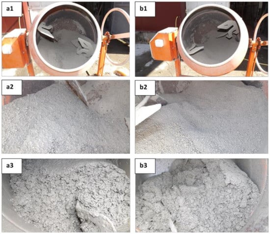 Composition preparation: (a1) dry components of sunflower stalks composites, mixed within portable electric concrete mixer; (a2) dry components of sunflower stalks composites, close up view; (a3) sunflower stalks composite in fresh state; (b1) dry components of corn cobs composites, mixed within portable electric concrete mixer; (b2) dry components of corn cobs composites, close up view; (b3) corn cobs composite in fresh state.