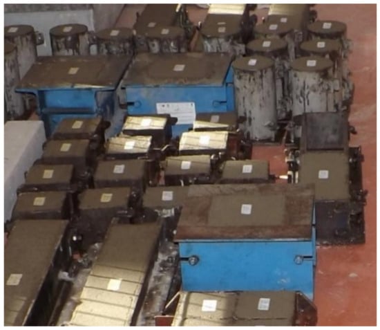 The developed composites were cast in 150 mm cube molds for the compression test, in 100 mm cube molds for repeated freeze-thaw cycles testing and in cylinder molds with 100 mm diameter and 200 mm length for splitting tensile testing and for measuring the modulus of elasticity (Figure 3). The concrete compositions were made according to NE 012/1-2007 [28]. Concrete specimens were unmolded after 24 h, then they were cured for 28 days in ambient conditions, with air temperature of 20 ± 5 °C and relative humidity of 45 ± 10%.