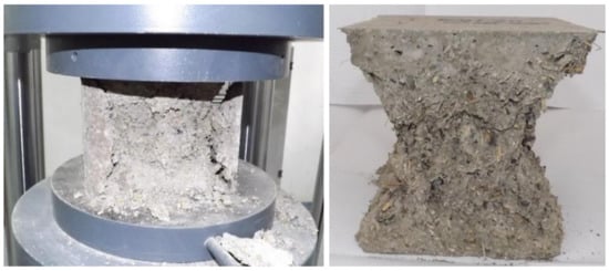 As comparative literature, to our knowledge, very few papers analyzed the behavior of these natural materials into a cement based composite and none in the manner this study did, as regards the treatment of vegetal aggregates and their percentage in the composite composition. Życiński et al., 2020 [25] studied a concrete with 3 wt%, 5 wt%, and 10 wt% of simple ground corncob, without any treatment applied to the vegetal raw material. They obtained a decrease in density of around 7%, in compressive strength of around 50% and in splitting tensile strength of almost 24%, compared to reference. Pinto et al., 2012 [20] developed a lightweight concrete with corn cobs broken in large pieces with a mix ratio of 6:1:1 and 3:1:1 (aggregates: Portland cement: water). Their compositions registered a density of 382 kg/m3 and 778 kg/m3, respectively, and a compressive strength of 0.120 N/mm2 and 0.392 N/mm2, respectively. Pinto et al., 2012 [20] compared these recipes of corncob with similar ones made with expanded clay and they observed that corn cobs formed a material 34% lighter. They concluded that corn cob aggregates can provide sustainable and economic advantages as lightweight aggregates. Binici et al., 2016 [26] made a material from grounded corn cobs (named corn stalks in their research), cement, gypsum, NaOH, and aluminum dust with density between 0.5–0.8 kg/m3 and a compressive strength between 0.11–0.29 N/mm2. Nozahic et al., 2012 [24] developed a green material with grounded sunflower stalks and a pumice-lime binder instead of cement and used as reference a material made by the same method but with hemp. Their material with sunflower aggregates registered a density of 1084 kg/m3, smaller than the reference (1184 kg/m3) and a compressive strength of 2.52 N/mm2 also smaller than the reference (2.77 N/mm2). Mati-Baouche et al., 2014 [27] developed a material from sunflower stalks and chitosan and obtained a compressive strength of 2 N/mm2.