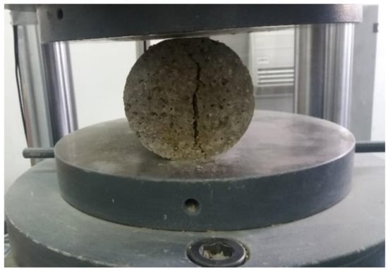 The splitting tensile strength test consisted of compressing cylinders of 200 mm length and 100 mm in diameter after two diametrically opposed generators, according to standard EN 12390-6: 2009 [35] (Figure 5). Three samples were tested, and the average result was calculated to assess the splitting tensile strength for each concrete mix. The values graph from the results section contains the error bars accordingly assessed.