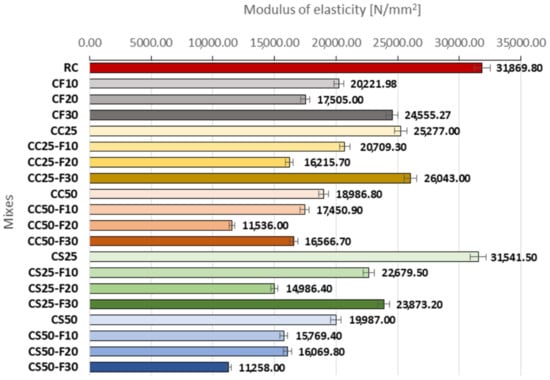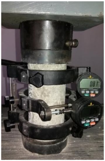 Modulus of elasticity is determined by strain change measuring (Figure 6) in the composite sample when loaded, to produce a stress between 0.5 N/mm2 and 1/3 of the compressive strength value of the sample determined previously according to EN 12390-3:2019 [34]. Three samples were tested, and the average result was calculated to assess the modulus of elasticity for each concrete mix. The values graph from the results section contains the error bars accordingly assessed.