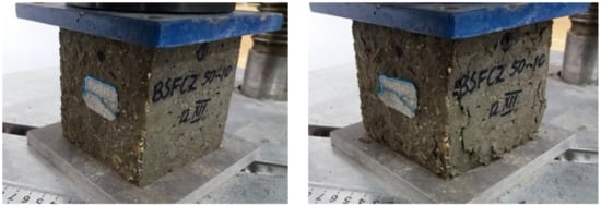 The cement-based composite specimens were tested at mono-axial compression according to EN 12390-3:2019 [34], at 28 days (Figure 4). The specimens were cubes with sides of 150 mm. Three samples were tested, and the average result was calculated to assess the compressive strength for each concrete mix. The values graph from the results section contains the error bars assessed accordingly.