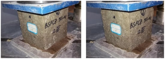 The three control specimens remain in the water bath all the time while the other three are placed alternatively in a cold room that maintains the temperature at −17 ± 2 °C for minimum 30 min at the end of the freeze stage, and then in a water bath. A cycle consists in 4 h of freezing, and 4 h of thawing in a water bath at a temperature of 20 ± 5 °C. At the final of 50 cycles, all the specimens are tested for compression, including the control specimens that were kept always in water (Figure 7 and Figure 8). The loss of compressive strength is calculated and analyzed.