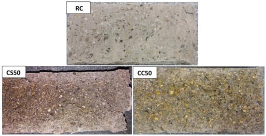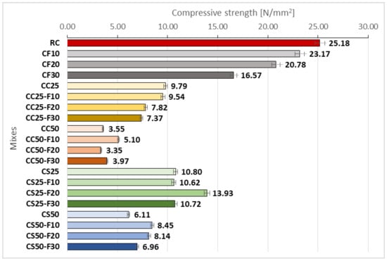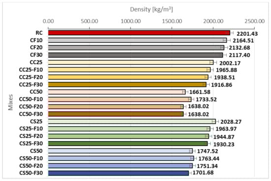According to Figure 12, the volume increase of fly ash to the detriment of the cement, led to a decrease in the composites’ density. The lowest density in the CF group was recorded by CF30, with a value of 2117.40 kg/m3, 3.83% lower than that of RC. CC25 recorded a decrease in density by around 9% compared to RC. It can be seen that the association of fly ash with corn cob aggregates had significant positive effects, as the CC-F group recorded the lowest density of all, below 2000 kg/m3, with a decrease between 13 and 11% compared to RC. CC50-F10 registered the smallest decrease in density, with 4.9% (Figure 12). The CC50-F group recorded density values lower than 1770 kg/m3, the decrease being between 25.59 and 21.25%, compared to RC.
