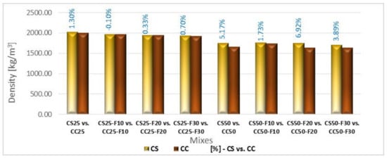 CS25 recorded a density about 8% lower than RC. From the Figure 12 analysis it is observed that the partial replacement of cement with fly ash (10, 20, 30%), in parallel with the replacement of conventional aggregates with 25% sunflower aggregates caused the density decrease by approx. 3–4.5%, compared to the value recorded by CS25.
