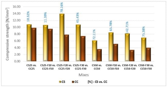 Sunflower composites registered a compressive strength decrease after 50 freeze-thaw cycles, of about 21% (Figure 23). The combination of CS25 and replacement of 10%, 20, and 30% of the cement volume with fly ash had positive effects on the loss of compressive strength following the freeze-thaw process. Thus, in the case of CS25-F20, the loss was 16%, in the case of CS25-F10, 5.64%, and in the case of CS25-F30, 6.4%. In CS50, the compressive strength decreased by 28%. The use of cement substitution rates of 10 and 20% led to a slight reduction of this decrease of compressive strength to 25.12 and 23.95%, respectively. The use of a cement substitution rate of 30% resulted in a substantial reduction in the loss of compressive strength following the 50 freeze-thaw cycles, CS50-F30 recording a lower compressive strength by 1.19% than the control sample.