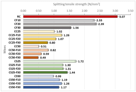 The splitting tensile strength of the analyzed compositions is shown in Figure 19. Fly ash in a rate of 10% decreased the splitting tensile strength of the RC by around 24%. In the case of CF20, an improvement in splitting tensile strength of up to 2.6% has been observed, than the previous variant with 10% fly ash. A surplus of another 10% fly ash (CF30) led to a decrease of this parameter by approximately 35 and 50% compared to CF20 and RC, respectively.
