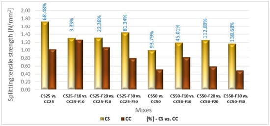 By using fly ash in the CC25 composite, an improvement in splitting tensile strength was obtained, by 4.9 and 23.53%, when using 20 and 10% fly ash instead of cement, respectively (Figure 19).