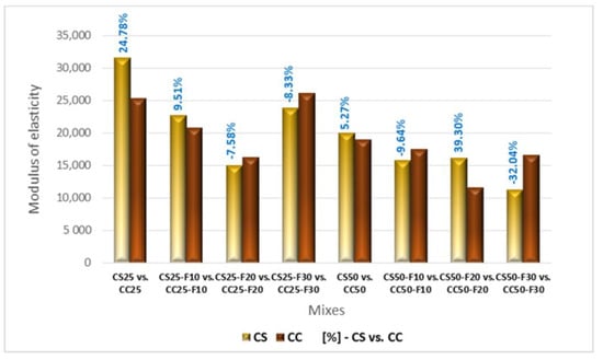 The association of fly ash with CS25 determined the same type of evolution of the elasticity modulus as in the case of the fly ash standard series, CF10, CF20, CF30 (Figure 21). In the case of CS50, the 30% replacement rate of the cement volume with fly ash contributed to the decrease of the modulus of elasticity compared to the replacement rate of 20%; CS50-F30 registered the lowest value of this parameter from this series of composites with sunflower aggregates.