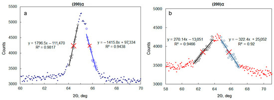 The XRD of worn specimens was performed on the as-worn surfaces. Plastic deformation of material as a result of AW causes peak broadening in XRD patterns. There are two ways to estimate peak width: full width on half maximum (FWHM) and integral breadth (IB). Firstly, the XRD pattern should be refined, but in case of worn specimens, the refinement of the whole pattern is hard to implement [33]. It is possible to estimate the FWHM of a given peak in the XRD pattern of worn material without fitting the whole diffractogram. Two slopes of a peak may be approximated by linear functions using limited sets of dots on an XRD pattern (Figure 1). Half of maximum would be the distance between the maximum value of intensity for a given peak and the mean intensity of a background. Intersections of linear approximations with half of the maximum level are two dots (red crosses on Figure 1), which were used to determine FWHM.