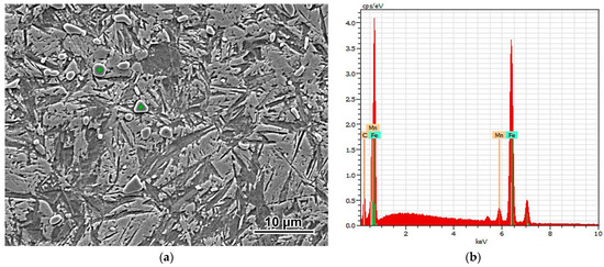 Since the XRD patterns did not present any carbide peak, an EDX study was employed to prove the existence of carbide in the steel quenched from 900 °C and 1000 °C. Point analysis performed on inclusions (as shown in Figure 3) revealed its average chemical composition as 8.46 ± 0.19 wt.% C, 5.92 ± 1.01 wt.% Mn, and 85.62 ± 1.06 wt.% Fe. According to these data, the inclusions can be identified as carbide (Fe, Mn)3C. The carbon content obtained was found to be higher than the stoichiometrical value of 6.67 wt.% for Fe3C. This discrepancy can be explained in view of the semi-qualitative character of EDX study, especially its high sensitivity to carbon contamination. Since the size of carbides was less than the EDX spatial resolution, the matrix affected the EDX result, leading to carbon content exaggeration.