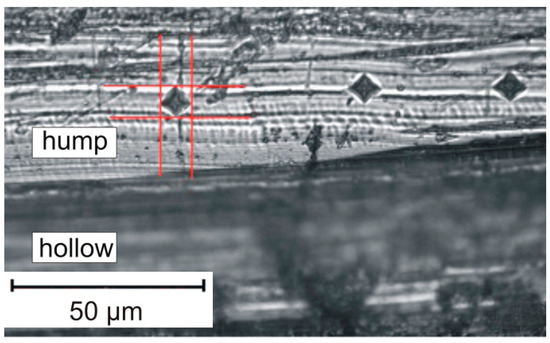 The same thought is expressed also in [40], with regards to how to overcome this obstacle. Not a cross-section, but the top surface is exposed to microhardness indentations. Despite the high surface roughness, small surface areas exist with very low roughness. Therefore, it is possible to make one or even several indents to measure microhardness (Figure 6). One minor problem is distinguishing humps from hollows and making indentations only on humps. This distinction can be made by a smooth approaching of the microscope lens to the surface. The humps are focused first, while hollows remain blurred (see Figure 6).