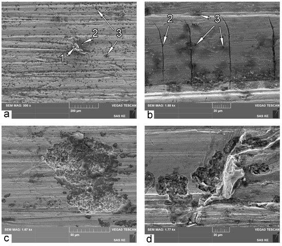 In contrast, SEM images of worn surface after wear in A mode (Figure 9a,b) show far fewer sites of high-cycle fatigue 1. This is because low-cycle fatigue and/or microcutting are predominant mechanisms of surface failure in A wear mode. Images in higher resolution reveal typical features of failure in these modes: cracking of ridges 2 (low-cycle fatigue) and formation of deep grooves (microcutting) as shown in Figure 9c,d.