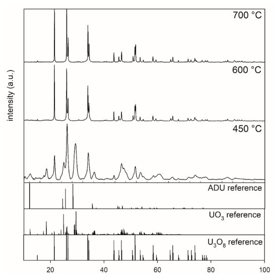 XRD patterns of powders after calcination at 450 °C, 600 °C, and 700 °C collected between 10° and 100° 2 theta, highlighting the effect of calcination of ADU (5 h, air) at different temperatures.