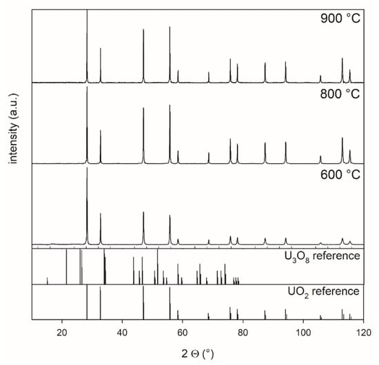 Figure 2. U3O8 powder, which was synthesized from ADU at 800 °C, was treated at 600, 800, and 900 °C for 5 h in a 4% H2–96% Ar mixture. The measurements showed that a complete transformation from U3O8 to UO2 occurred at all temperatures.