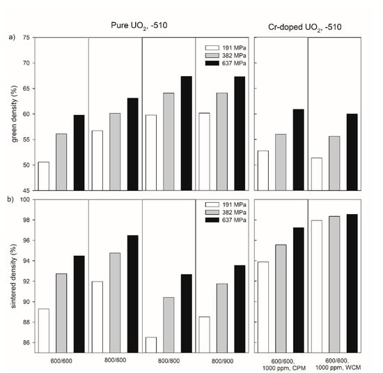 Green density (a) and sintered density of pure and Cr-doped UO2 pellets (b) produced at compaction pressures of 191, 382, and 637 MPa with different thermal history of the precursor materials. The numbers under the samples refer to the temperatures (°C) during the oxidative and reducing steps of the thermal treatment of the precursors. CPM = co-precipitation method, WCM = wet coating method. All pellets were sintered at an oxygen potential of −510 kJ/mol O2.